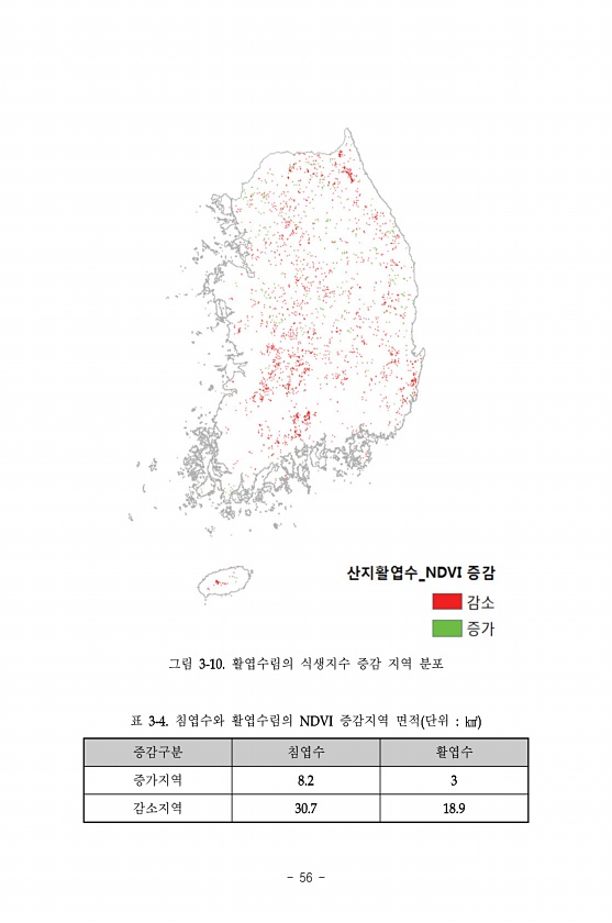 56 그림 활엽수림의 식생지수 증감 지역 분포 증감구분 침엽수 활엽수 증가지역 감소지역 표 침엽수와 활엽수림의 증감지역 면적단위