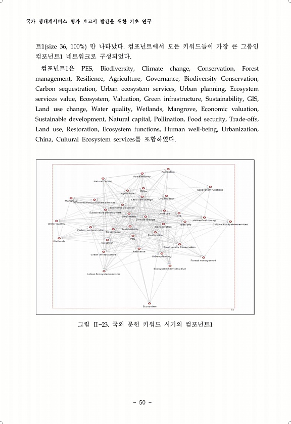 국가 생태계서비스 평가 보고서 발간을 위한 기초 연구 50 트1 size 36, 100% 만 나타났다. 컴포넌트에서 모든 키워드들이 가장 큰 그룹인 컴포넌트1 네트워크로 구성되었다. 컴포넌트1은 PES, Biodiversity, Climate change, Conservation, Forest management, Resilience, Agriculture, Governance, Biodiversity Conservation, Carbon sequestration, Urban ecosystem services, Urban planning, Ecosystem services value, Ecosystem, Valuation, Green infrastructure, Sustainability, GIS, Land...