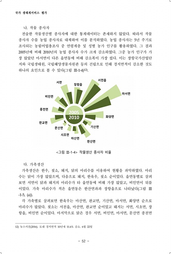 국가 생태계서비스 평가 52 나. 작물 종사자 전술한 작물생산별 종사자에 대한 통계데이터는 존재하지 않았다. 따라서 작물 종사자 수를 농업 종사자로 대체하여 이를 분석하였다. 농업 종사자는 5년 주기로 조사되는 농림어업총조사 중 연령계층 및 성별 농가 인구를 활용하였다. 그 결과 2005년에 비해 2010년의 농업 종사자 수가 크게 감소하였다. 그중 농가 인구가 가 장 많았던 마서면이 다른 읍면동에 비해 감소폭이 가장 컸다. 이는 장항국가산업단 지와 국립생태원, 국립해양생물자원관 등의 건립으로 인해 경지면적이 감소한 것도 하나의 요인으로 볼 수 있다 그림 Ⅲ-1-4 12 그림 Ⅲ-1-4 작물생산 종사자 비율 다. 가축생산 가축생산은 한우, 젖소, 돼지, 닭의 마리수를 이용하여 현황을 파악하였다. 마리 수는 ...