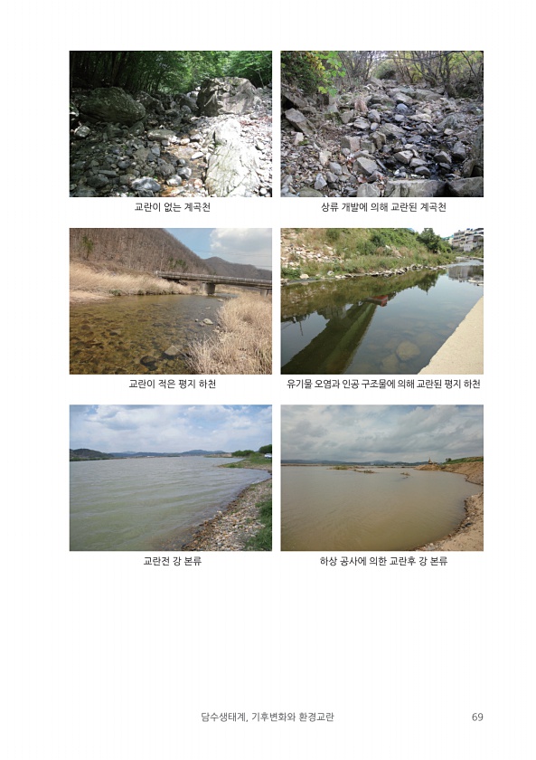 담수생태계, 기후변화와 환경교란 69 교란이 없는 계곡천 상류 개발에 의해 교란된 계곡천 교란이 적은 평지 하천 유기물 오염과 인공 구조물에 의해 교란된 평지 하천 교란전 강 본류 하상 공사에 의한 교란후 강본류