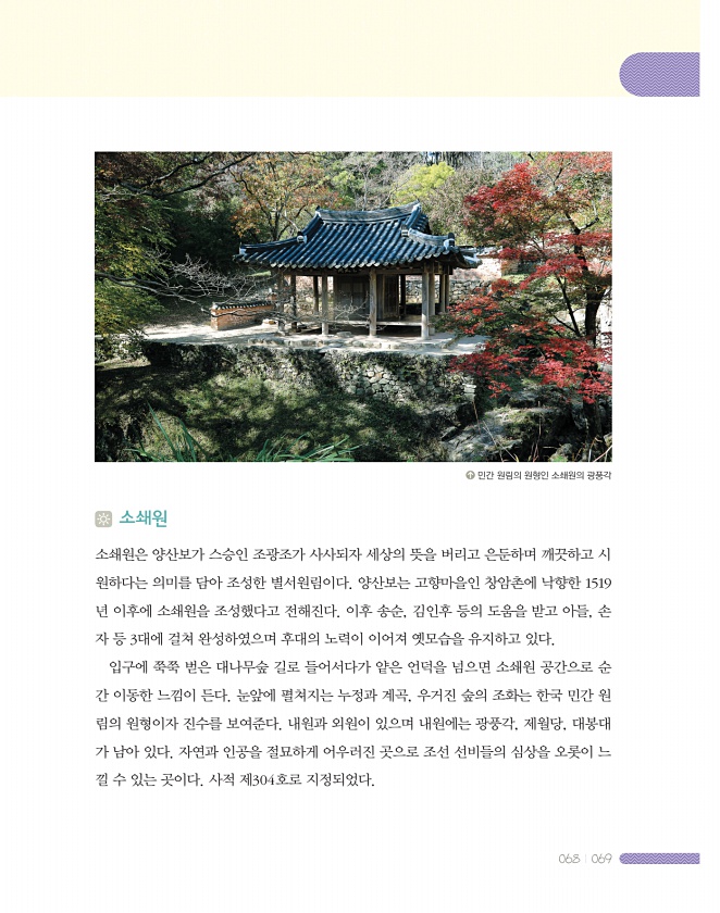 068 069 소쇄원 소쇄원은 양산보가 스승인 조광조가 사사되자 세상의 뜻을 버리고 은둔하며 깨끗하고 시 원하다는 의미를 담아 조성한 별서원림이다. 양산보는 고향마을인 창암촌에 낙향한 1519 년 이후에 소쇄원을 조성했다고 전해진다. 이후 송순, 김인후 등의 도움을 받고 아들, 손 자 등 3대에 걸쳐 완성하였으며 후대의 노력이 이어져 옛모습을 유지하고 있다. 입구에 쭉쭉 벋은 대나무숲 길로 들어서다가 얕은 언덕을 넘으면 소쇄원 공간으로 순 간 이동한 느낌이 든다. 눈앞에 펼쳐지는 누정과 계곡, 우거진 숲의 조화는 한국 민간 원 림의 원형이자 진수를 보여준다. 내원과 외원이 있으며 내원에는 광풍각, 제월당, 대봉대 가 남아 있다. 자연과 인공을 절묘하게 어우러진 곳으로 조선 선비들의 심상을 오롯이 느 낄 수 ...