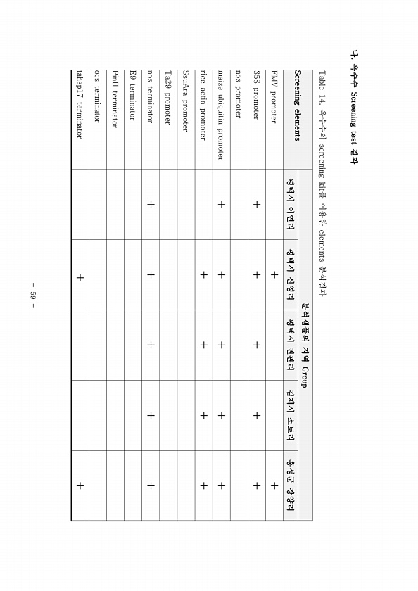 59 나. 옥수수 Screening test 결과 Screening elements 분석샘플의 지역 Group 평택시 어연리 평택시 신영리 평택시 권관리 김제시 소토리 홍성군 장양리 FMV promoter + + 35S promoter + + + + + nos promoter maize ubiquitin promoter + + + + + rice actin promoter + + + + SsuAra promoter Ta29 promoter nos terminator + + + + + E9 terminator PinII terminator ocs terminator tahsp17 terminator + + Table 14. 옥수수의 screening kit를 이용한 elements분석결과