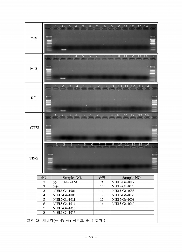 T45 Ms8 Rf3 GT73 T19-2 순번 Sample NO. 순번 Sample NO. 1 con. Non-LM 9 NIE15-G4-1017 2 + con. 10 NIE15-G4-1020 3 NIE15-G4-1004 11 NIE15-G6-1033 4 NIE15-G4-1005 12 NIE15-G6-1035 5 NIE15-G4-1011 13 NIE15-G6-1039 6 NIE15-G4-1014 14 NIE15-G6-1040 7 NIE15-G4-1015 8 NIE15-G4-1016 그림 29. 캐놀라 음성반응 이벤트 분석결과-2