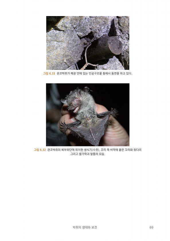 박쥐의 생태와 보전 69 그림 6.32 관코박쥐의 복부하단에 위치한 생식기 수컷 , 꼬리 쪽 비막에 붙은 꼬리와 뒷다리 그리고 발가락과 발톱의 모습. 그림 6.33 관코박쥐가 폐광 안에 있는 인공구조물 틈에서 동면을 하고있다.