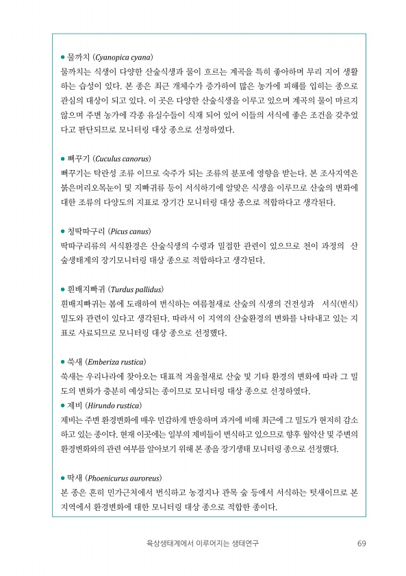 육상생태계에서 이루어지는 생태연구 69 ● 물까치 Cyanopica cyana 물까치는 식생이 다양한 산숲식생과 물이 흐르는 계곡을 특히 좋아하며 무리 지어 생활 하는 습성이 있다. 본 종은 최근 개체수가 증가하여 많은 농가에 피해를 입히는 종으로 관심의 대상이 되고 있다. 이 곳은 다양한 산숲식생을 이루고 있으며 계곡의 물이 마르지 않으며 주변 농가에 각종 유실수들이 식재 되어 있어 이들의 서식에 좋은 조건을 갖추었 다고 판단되므로 모니터링 대상 종으로 선정하였다. ● 뻐꾸기 Cuculus canorus 뻐꾸기는 탁란성 조류 이므로 숙주가 되는 조류의 분포에 영향을 받는다. 본 조사지역은 붉은머리오목눈이 및 지빠귀류 등이 서식하기에 알맞은 식생을 이루므로 산숲의 변화에 대한 조류의 다양도의 지표로 장기간 ...