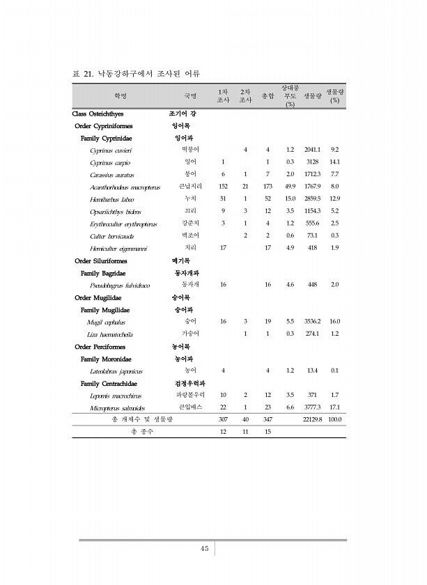 45 학명 국명 1차 조사 2차 조사 총합 상대풍 부도 % 생물량 생물량 % Class Osteichthyes 조기어 강 Order Cypriniformes 잉어목 Family Cyprinidae 잉어과 Cyprinus cuvieri 떡붕어 4 4 1.2 2041.1 9.2 Cyprinus carpio 잉어 1 1 0.3 3128 14.1 Carassius auratus 붕어 6 1 7 2.0 1712.3 7.7 Acanthorhodeus macropterus 큰납지리 152 21 173 49.9 1767.9 8.0 Hemibarbus labeo 누치 51 1 52 15.0 2859.5 12.9 Opsariichthys bidens 끄리 9 3 12 3.5 1154.3 5.2 Erythroculter ery...