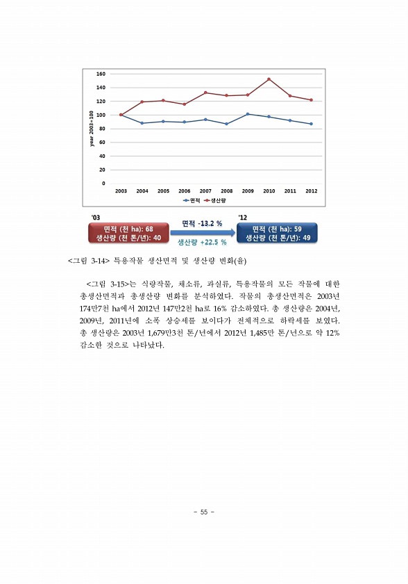 55 그림 3-14 특용작물 생산면적 및 생산량 변화 율 그림 3-15 는 식량작물, 채소류, 과실류, 특용작물의 모든 작물에 대한 총생산면적과 총생산량 변화를 분석하였다. 작물의 총생산면적은 2003년 174만7천 ha에서 2012년 147만2천 ha로 16% 감소하였다. 총 생산량은 2004년, 2009년, 2011년에 소폭 상승세를 보이다가 전체적으로 하락세를 보였다. 총 생산량은 2003년 1,679만3천 톤/년에서 2012년 1,485만 톤/년으로 약 12% 감소한 것으로나타났다.