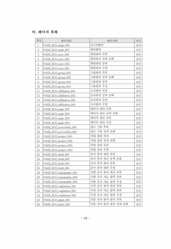 54 번호 페이지ID 페이지명 비고 1 PAGE_ECO_login_001 로그인화면 신규 2 PAGE_ECO_main_001 메인화면 신규 3 PAGE_ECO_user_001 회원관리 목록 신규 4 PAGE_ECO_user_002 회원관리 상세 조회 신규 5 PAGE_ECO_user_003 회원관리 등록 신규 6 PAGE_ECO_user_004 회원관리 수정 신규 7 PAGE_ECO_group_001 그룹관리 목록 신규 8 PAGE_ECO_group_002 그룹관리 상세 조회 신규 9 PAGE_ECO_group_003 그룹관리 등록 신규 10 PAGE_ECO_group_004 그룹관리 수정 신규 11 PAGE_ECO_affiliation_001 소속관리 목록 신규 12 PAGE_ECO_affiliation_...