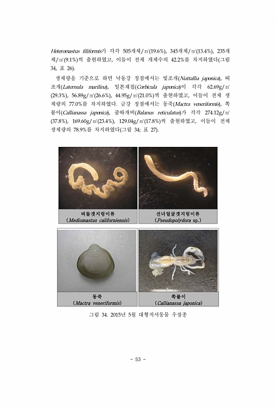53 Heteromastus filiformis가 각각 505개체/㎡ 19.6% , 345개체/㎡ 13.4% , 235개 체/㎡ 9.1% 씩 출현하였고, 이들이 전체 개체수의 42.2%를 차지하였다 그림 34, 표 26 생체량을 기준으로 하면 낙동강 정점에서는 빛조개 Nuttallia japonica , 띠 조개 Laternula marilina , 일본재첩 Corbicula japonica 이 각각 62.69g/㎡ 29.3% , 56.89g/㎡ 26.6% , 44.95g/㎡ 21.0% 씩 출현하였고, 이들이 전체 생 체량의 77.0%를 차지하였다. 금강 정점에서는 동죽 Mactra veneriformis , 쏙 붙이 Callianassa japonica , 줄따개비 Balanus reticulatus 가 ...