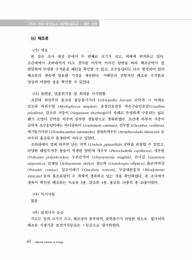 2015 전국 무인도서 자연환경조사 태안 권역 60 ? National Institute of Ecology 6 해조류 가 개요 본 섬은 조사 대상 중에서 두 번째로 크기가 크고, 외해에 위치하고 있다. 조간대에서 조하대까지 다소 경사를 이루며 이어진 암반을 따라 해조군락이 잘 발달하여 뚜렷한 수직분포 패턴을 확인할 수 있고, 조수웅덩이도 다수 형성되어 있어 해조류의 생육에 양호한 기질을 제공한다. 서해안의 전형적인 해조류 수직분포 양상과 다양한 종을 확인할 수 있었다. 나 출현종, 멸종위기종 및 희귀종 서식현황 조간대 최상부의 홍조류 불등풀가사리 Gloiopeltis furcata 군락과 그 아래로 갈조류 바위수염 Myelophycus simplex , 유절산호말류 작은구슬산호말 Corallina pilu...