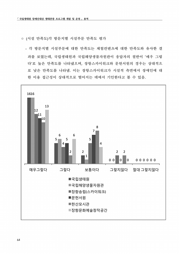 ?국립생태원 장애인대상 생태관광 프로그램 개발 및 운영? 용역 64 ? 시설 만족도 각 방문지별 시설부문 만족도 평가 각 방문지별 시설부문에 대한 만족도는 체험컨텐츠에 대한 만족도와 유사한 결 과를 보였는데, 국립생태원과 국립해양생물자원관이 응답자의 절반이 ‘매우 그렇 다’로 높은 만족도를 나타냈으며, 장항스카이워크와 문헌서원의 경우는 상대적으 로 낮은 만족도를 나타냄. 이는 장항스카이워크가 시설적 측면에서 장애인에 대 한 이용 접근성이 상대적으로 떨어지는 데에서 기인한다고 볼 수 있음. 16 5 2 0 0 16 6 1 0 0 12 4 5 2 0 11 5 7 0 0 10 2 8 2 0 13 6 4 0 0 매우그렇다 그렇다 보통이다 그렇지않다 절대 그렇지않다 국립생태원 국립해양생물자원관 장항송림 스카이워크 문...