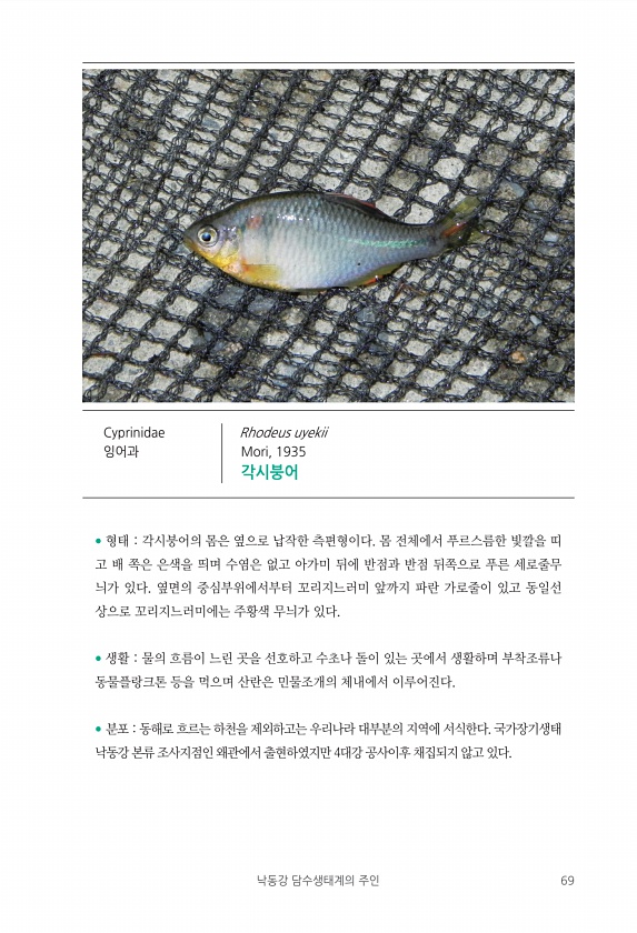 낙동강 담수생태계의 주인 69 ? 형태 각시붕어의 몸은 옆으로 납작한 측편형이다. 몸 전체에서 푸르스름한 빛깔을 띠 고 배 쪽은 은색을 띄며 수염은 없고 아가미 뒤에 반점과 반점 뒤쪽으로 푸른 세로줄무 늬가 있다. 옆면의 중심부위에서부터 꼬리지느러미 앞까지 파란 가로줄이 있고 동일선 상으로 꼬리지느러미에는 주황색 무늬가 있다. ? 생활 물의 흐름이 느린 곳을 선호하고 수초나 돌이 있는 곳에서 생활하며 부착조류나 동물플랑크톤 등을 먹으며 산란은 민물조개의 체내에서 이루어진다. ? 분포 동해로 흐르는 하천을 제외하고는 우리나라 대부분의 지역에 서식한다. 국가장기생태 낙동강 본류 조사지점인 왜관에서 출현하였지만 4대강 공사이후 채집되지 않고 있다. Cyprinidae 잉어과 Rhodeus uyekii Mori, ...