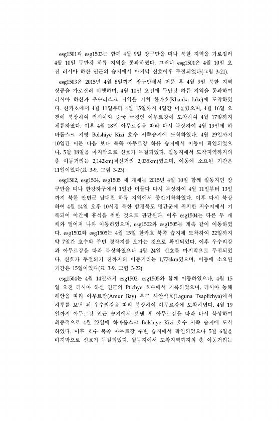 esg1501과 esg1503는 함께 4월 9일 장구만을 떠나 북한 지역을 가로질러 4월 10일 두만강 하류 지역을 통과하였다. 그러나 esg1501은 4월 10일 오 전 러시아 하산 인근의 습지에서 마지막 신호이후 두절되었다 그림 3-21 esg1503은 2015년 4월 8일까지 장구만에서 머문 후 4월 9일 북한 지역 상공을 가로질러 비행하며, 4월 10일 오전에 두만강 하류 지역을 통과하여 러시아 하산과 우수리스크 지역을 거쳐 한카호 Khanka lake 에 도착하였 다. 한카호에서 4월 11일부터 4월 15일까지 4일간 머물렸으며, 4월 16일 오 전에 북상하여 러시아와 중국 국경인 아무르강에 도착하여 4월 17일까지 체류하였다. 이후 4월 18일 아무르강을 따라 다시 북상하여 4월 19일에 하 바롭...