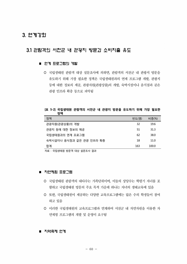 60 3. 연계강화 3.1 관람객의 서천군 내 관광지 방문과 소비지출 유도 n 연계 프로그램의 개발 ¡ 국립생태원 관람객 대상 설문조사에 의하면, 관람객의 서천군 내 관광지 방문을 유도하기 위해 가장 필요한 정책은 국립생태원과의 연계 프로그램 개발, 관광지 등에 대한 정보의 제공, 관광자원 관광상품 의 개발, 숙박시설이나 음식점과 같은 관광 인프라 확충 등으로 파악됨 [표 5-2] 국립생태원 관람객의 서천군 내 관광지 방문을 유도하기 위해 가장 필요한 정책 정책 빈도 명 비중 % 관광자원 관광상품 의 개발 32 19.6 관광지 등에 대한 정보의 제공 51 31.3 국립생태원과의 연계 프로그램 62 38.0 숙박시설이나 음식점과 같은 관광 인프라 확충 18 11.0 합계 163 100.0 자료 국립생태원 방문...