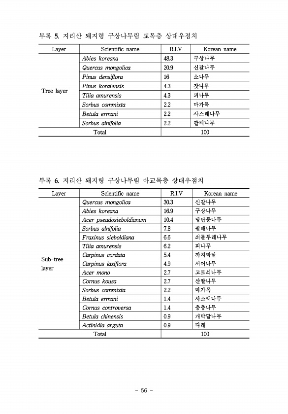 56 부록 지리산 돼지령 구상나무림 교목층 상대우점치 부록 지리산 돼지령 구상나무림 아교목층상대우점치