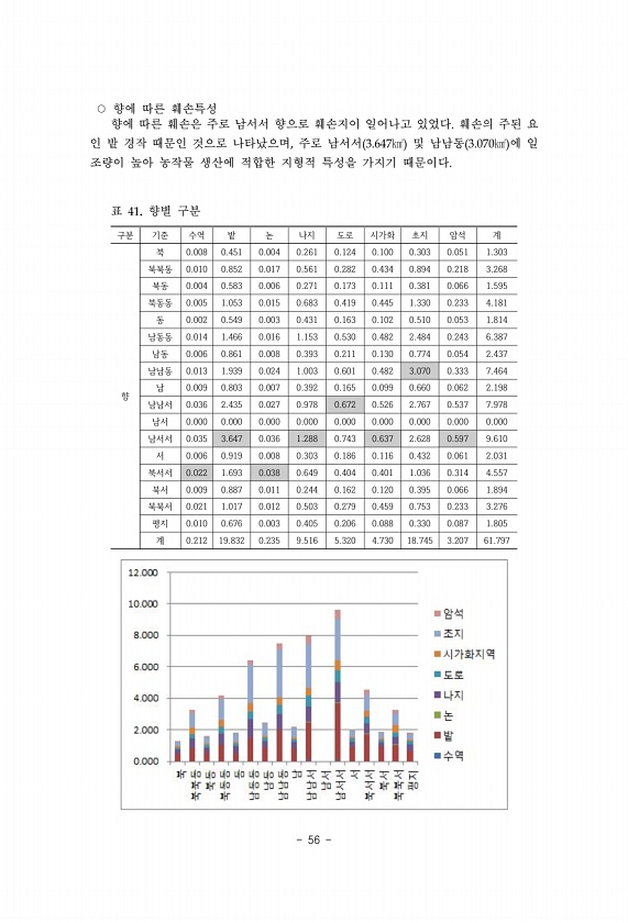 56 ○ 향에 따른 훼손특성 향에 따른 훼손은 주로 남서서 향으로 훼손지이 일어나고 있었다. 훼손의 주된 요 인 밭 경작 때문인 것으로 나타났으며, 주로 남서서 3.647㎢ 및 남남동 3.070㎢ 에 일 조량이 높아 농작물 생산에 적합한 지형적 특성을 가지기 때문이다. 구분 기준 수역 밭 논 나지 도로 시가화 초지 암석 계 향 북 0.008 0.451 0.004 0.261 0.124 0.100 0.303 0.051 1.303 북북동 0.010 0.852 0.017 0.561 0.282 0.434 0.894 0.218 3.268 북동 0.004 0.583 0.006 0.271 0.173 0.111 0.381 0.066 1.595 북동동 0.005 1.053 0.015 0.683 0.419 0.445 1.330...