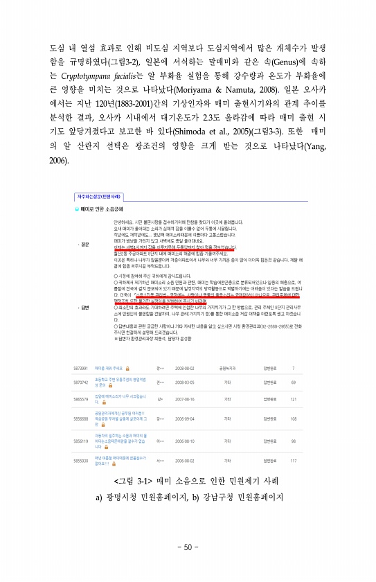 도심 내 열섬 효과로 인해 비도심 지역보다 도심지역에서 많은 개체수가 발생 함을 규명하였다 그림3-2 , 일본에 서식하는 말매미와 같은 속 Genus 에 속하 는 Cryptotympana facialis는 알 부화율 실험을 통해 강수량과 온도가 부화율에 큰 영향을 미치는 것으로 나타났다 Moriyama & Namuta, 2008 일본 오사카 에서는 지난 120년 1883-2001 간의 기상인자와 매미 출현시기와의 관계 추이를 분석한 결과, 오사카 시내에서 대기온도가 2.3도 올라감에 따라 매미 출현 시 기도 앞당겨졌다고 보고한 바 있다 Shimoda et al., 2005 그림3-3 또한 매미 의 알 산란지 선택은 광조건의 영향을 크게 받는 것으로 나타났다 Yang, 2006 그림 3-1 매미 소음으로 인한...