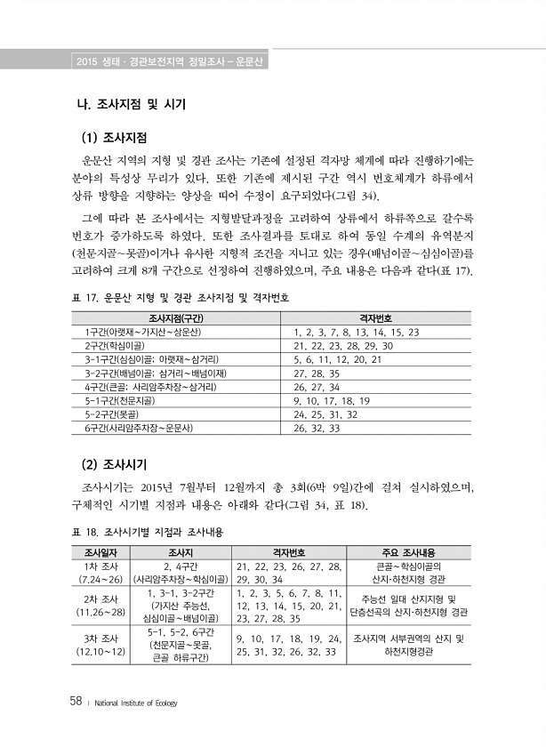 2015 생태·경관보전지역 정밀조사 운문산 58 ? National Institute of Ecology 나. 조사지점 및 시기 1 조사지점 운문산 지역의 지형 및 경관 조사는 기존에 설정된 격자망 체계에 따라 진행하기에는 분야의 특성상 무리가 있다. 또한 기존에 제시된 구간 역시 번호체계가 하류에서 상류 방향을 지향하는 양상을 띠어 수정이 요구되었다 그림 34 그에 따라 본 조사에서는 지형발달과정을 고려하여 상류에서 하류쪽으로 갈수록 번호가 증가하도록 하였다. 또한 조사결과를 토대로 하여 동일 수계의 유역분지 천문지골∼못골 이거나 유사한 지형적 조건을 지니고 있는 경우 배넘이골∼심심이골 를 고려하여 크게 8개 구간으로 선정하여 진행하였으며, 주요 내용은 다음과 같다 표 17 조사지점 구간 격자번호 1구간 ...