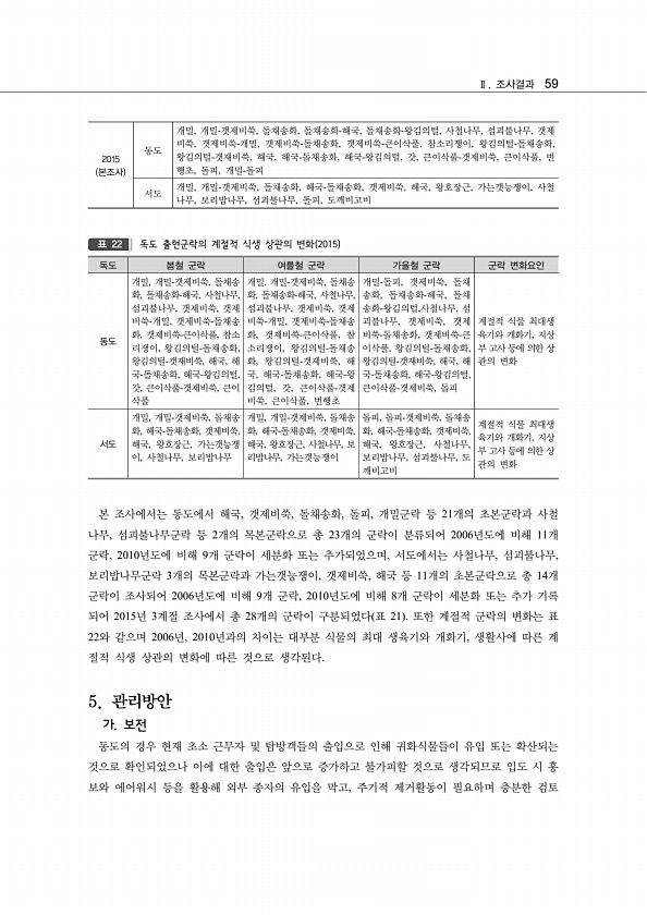 Ⅱ. 조사결과 59 독도 봄철 군락 여를철 군락 가을철 군락 군락 변화요인 동도 개밀, 개밀-갯제비쑥, 돌채송 화, 돌채송화-해국, 사철나무, 섬괴불나무, 갯제비쑥, 갯제 비쑥-개밀, 갯제비쑥-돌채송 화, 갯제비쑥-큰이삭풀, 참소 리쟁이, 왕김의털-돌채송화, 왕김의털-갯재비쑥, 해국, 해 국-돌채송화, 해국-왕김의털, 갓, 큰이삭풀-갯제비쑥, 큰이 삭풀 개밀, 개밀-갯제비쑥, 돌채송 화, 돌채송화-해국, 사철나무, 섬괴불나무, 갯제비쑥, 갯제 비쑥-개밀, 갯제비쑥-돌채송 화, 갯제비쑥-큰이삭풀, 참 소리쟁이, 왕김의털-돌채송 화, 왕김의털-갯제비쑥, 해 국, 해국-돌채송화, 해국-왕 김의털, 갓, 큰이삭풀-갯제 비쑥, 큰이삭풀, 번행초 개밀-돌피, 갯제비쑥, 돌채 송화, 돌채송화-해국, 돌채 송화-왕김의털,...