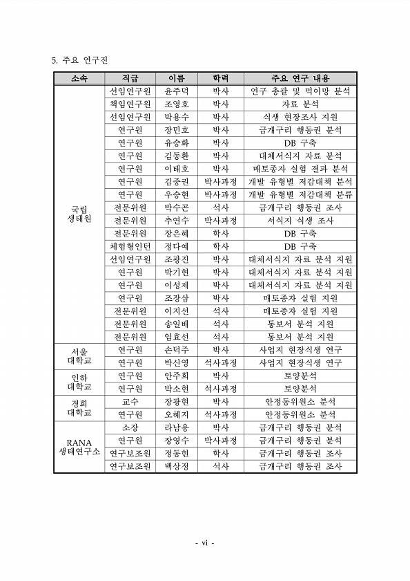 주요 연구진 소속 직급 이름 학력 주요 연구 내용 국립 생태원 선임연구원 윤주덕 박사 연구 총괄 및 먹이망 분석 책임연구원 조영호 박사 자료 분석 선임연구원 박용수 박사 식생 현장조사 지원 연구원 장민호 박사 금개구리 행동권 분석 연구원 유승화 박사 구축 연구원 김동환 박사 대체서식지 자료 분석 연구원 이태호 박사 매토종자 실험 결과 분석 연구원 김중권 박사과정 개발 유형별 저감대책 분석 연구원 우승현 박사과정 개발 유형별 저감대책 분류 전문위원 박수곤 석사 금개구리 행동권 조사 전문위원 추연수 박사과정 서식지 식생 조사 전문위원 장은혜 학사 구축 체험형인턴 정다예 학사 구축 선임연구원 조광진 박사 대체서식지 자료 분석 지원 연구원 박기현 박사 대체서식지 자료 분석 지원 연구원 이성제 박사 대체서식지 자료 ...