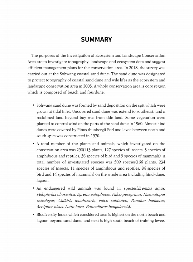 SUMMARY The purposes of the Investigation of Ecosystem and Landscape Conservation Area are to investigate topography, landscape and ecosystem data and suggest efficient management plans for the conservation area. In 2018, the survey was carried out at the Sohwang coastal sand dune. The sand dune was designated to protect topography of coastal sand dune and wile lifes as the ecosystem and landscape...