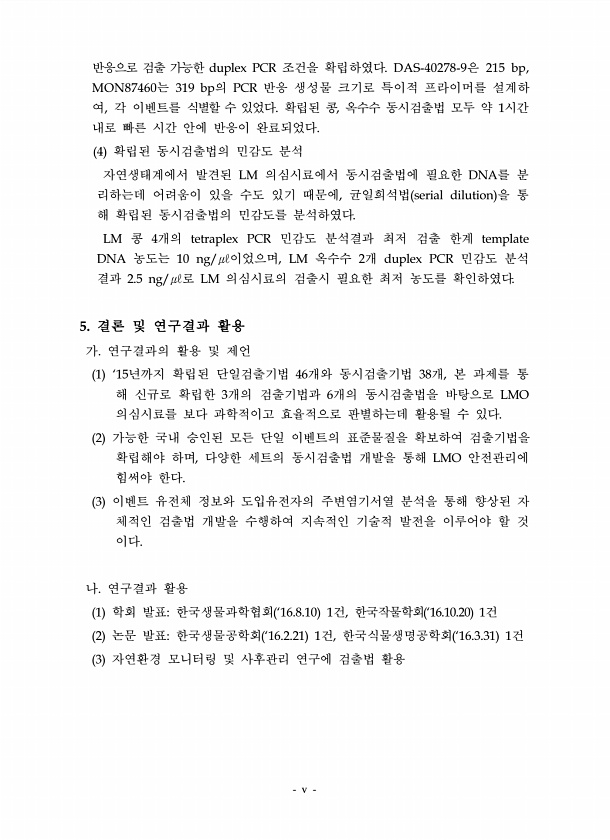 v 반응으로 검출 가능한 duplex PCR 조건을 확립하였다. DAS-40278-9은 215 bp, MON87460는 319 bp의 PCR 반응 생성물 크기로 특이적 프라이머를 설계하 여, 각 이벤트를 식별할 수 있었다. 확립된 콩, 옥수수 동시검출법 모두 약 1시간 내로 빠른 시간 안에 반응이 완료되었다. 4 확립된 동시검출법의 민감도 분석 자연생태계에서 발견된 LM 의심시료에서 동시검출법에 필요한 DNA를 분 리하는데 어려움이 있을 수도 있기 때문에, 균일희석법 serial dilution 을 통 해 확립된 동시검출법의 민감도를 분석하였다. LM 콩 4개의 tetraplex PCR 민감도 분석결과 최저 검출 한계 template DNA 농도는 10 ng/㎕이었으며, LM 옥수수 2개 duplex PCR...