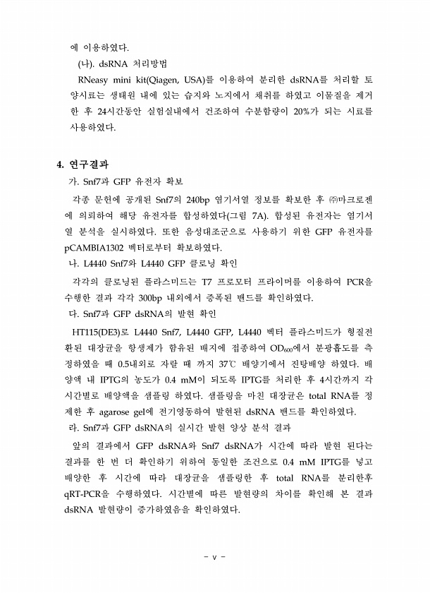 에 이용하였다. 나 dsRNA 처리방법 RNeasy mini kit Qiagen, USA 를 이용하여 분리한 dsRNA를 처리할 토 양시료는 생태원 내에 있는 습지와 노지에서 채취를 하였고 이물질을 제거 한 후 24시간동안 실험실내에서 건조하여 수분함량이 20%가 되는 시료를 사용하였다. 4. 연구결과 가. Snf7과 GFP 유전자 확보 각종 문헌에 공개된 Snf7의 240bp 염기서열 정보를 확보한 후 ㈜마크로젠 에 의뢰하여 해당 유전자를 합성하였다 그림 7A 합성된 유전자는 염기서 열 분석을 실시하였다. 또한 음성대조군으로 사용하기 위한 GFP 유전자를 pCAMBIA1302 벡터로부터 확보하였다. 나. L4440 Snf7와 L4440 GFP 클로닝 확인 각각의 클로닝된 플라스미드는 T7 프로모터 프라이머...