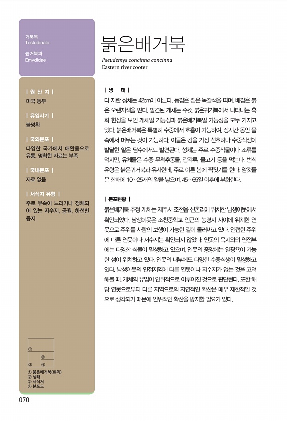 070 ① ② ③ ④ | 생 태 | 다 자란 성체는 42cm에 이른다. 등갑은 짙은 녹갈색을 띠며, 배갑은 붉 은 오렌지색을 띤다. 발견된 개체는 수컷 붉은귀거북에서 나타나는 흑 화 현상을 보인 개체일 가능성과 붉은배거북일 가능성을 모두 가지고 있다. 붉은배거북은 특별히 수중에서 호흡이 가능하여, 장시간 동안 물 속에서 머무는 것이 가능하다. 이들은 강을 가장 선호하나 수중식생이 발달한 얕은 담수에서도 발견된다. 성체는 주로 수중식물이나 조류를 먹지만, 유체들은 수중 무척추동물, 갑각류, 물고기 등을 먹는다. 번식 유형은 붉은귀거북과 유사한데, 주로 이른 봄에 짝짓기를 한다. 암컷들 은 한배에 1025개의 알을 낳으며, 4565일 이후에 부화한다. | 분포현황 | 붉은배거북 추정 개체는 제주시 조천읍 신촌리...