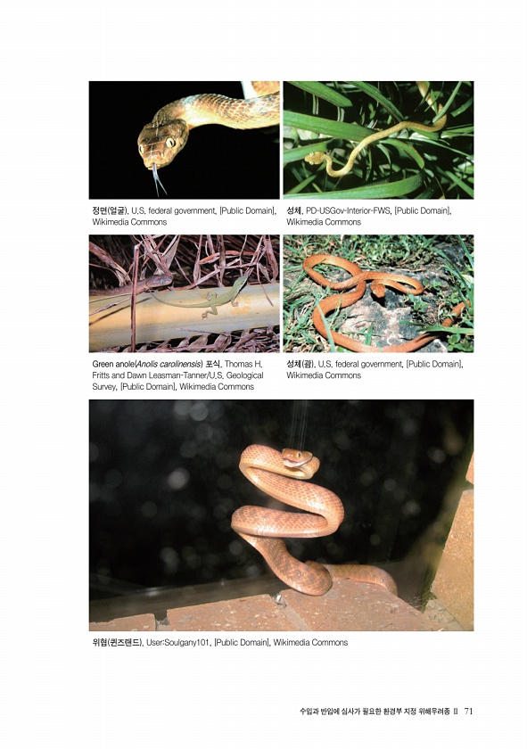 수입과 반입에 심사가 필요한 환경부 지정 위해우려종 Ⅱ 71 정면 얼굴 U.S. federal government, [Public Domain], Wikimedia Commons Green anole Anolis carolinensis 포식. Thomas H. Fritts and Dawn Leasman-Tanner/U.S. Geological Survey, [Public Domain], Wikimedia Commons 위협 퀸즈랜드 UserSoulgany101, [Public Domain], Wikimedia Commons 성체. PD-USGov-Interior-FWS, [Public Domain], Wikimedia Commons 성체 괌 U.S. federal government, [Public Doma...