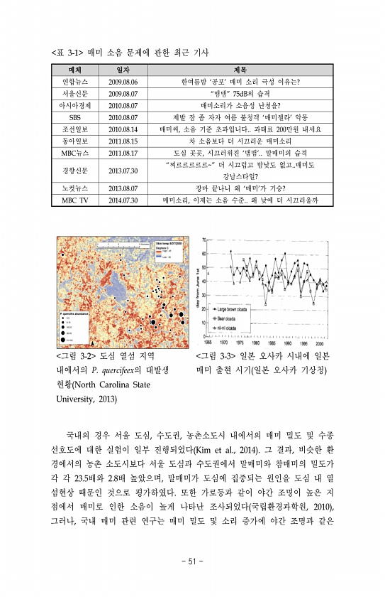 매체 일자 제목 연합뉴스 2009.08.06 한여름밤 ‘공포’ 매미 소리 극성 이유는? 서울신문 2009.08.07 “맴맴” 75dB의 습격 아시아경제 2010.08.07 매미소리가 소음성 난청을? SBS 2010.08.07 제발 잠 좀 자자 여름 불청객 ‘매미젤라’ 악몽 조선일보 2010.08.14 매미씨, 소음 기준 초과입니다.. 과태료 200만원 내세요 동아일보 2011.08.15 차 소음보다 더 시끄러운 매미소리 MBC뉴스 2011.08.17 도심 곳곳, 시끄러워진 ‘맴맴’.. 말매미의 습격 경향신문 2013.07.30 “찌르르르르르” 더 시끄럽고 밤낮도 없고..매미도 강남스타일? 노컷뉴스 2013.08.07 장마 끝나니 왜 ‘매미’가 기승? MBC TV 2014.07.30 매미소리, 이제는 소음 수...