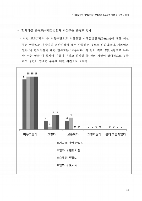 ?국립생태원 장애인대상 생태관광 프로그램 개발 및 운영? 용역 65 ? 열차시설 만족도 서해금빛열차 시설부문 만족도 평가 이번 프로그램의 주 이동수단으로 이용했던 서해금빛열차 G-train 에 대한 시설 부문 만족도는 응답자의 과반이상이 매우 만족하는 것으로 나타났으나, 기차역과 열차 내 편의시설에 대한 만족도는 ‘보통이다’ 의 답이 각각 3명, 4명으로 나타 남. 이는 열차 내 휠체어 이동이 어렵고 화장실 등 편의 시설이 상대적으로 부족 하고 공간이 협소한 부분에 대한 의견으로 보여짐. 17 3 3 0 0 18 1 4 0 0 18 5 0 0 0 18 5 0 0 0 매우그렇다 그렇다 보통이다 그렇지않다 절대 그렇지않다 기차역 관련 만족도 열차 내 편의시설 승무원 친절도 열차 내도시락