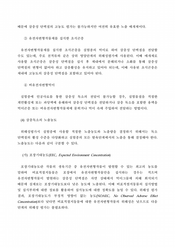 때문에 살충성 단백질의 고농도 평가는 불가능하지만 여전히 유효한 노출 매개체이다. ③ 유전자변형작물체를 섭식한 초식곤충 유전자변형작물체를 섭식한 초식곤충을 실험종의 먹이로 하여 살충성 단백질을 전달할 수도 있는데, 주로 천적류와 같은 상위 영양단계의 위해성평가에 사용된다. 이때 매개체로 사용할 초식곤충은 살충성 단백질을 섭식 후 체내에서 분해되거나 소화를 통해 살충성 단백질의 변형이 없어야 하고 살충활성을 유지하고 있어야 되는데, 이때 사용된 초식곤충은 체내에 고농도의 살충성 단백질을 포함하고 있어야 된다. ④ 비유전자변형먹이 실험종에 인공사료를 통한 살충성 독소의 전달이 불가능할 경우, 실험물질을 적절한 계면활성제 또는 과당액에 용해하여 살충성 단백질을 전달하거나 살충 독소를 포함한 용액을 먹이곤충 또는 ...