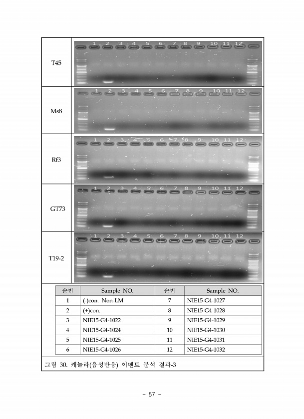 T45 Ms8 Rf3 GT73 T19-2 순번 Sample NO. 순번 Sample NO. 1 con. Non-LM 7 NIE15-G4-1027 2 + con. 8 NIE15-G4-1028 3 NIE15-G4-1022 9 NIE15-G4-1029 4 NIE15-G4-1024 10 NIE15-G4-1030 5 NIE15-G4-1025 11 NIE15-G4-1031 6 NIE15-G4-1026 12 NIE15-G4-1032 그림 30. 캐놀라 음성반응 이벤트 분석결과-3