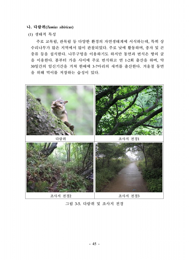 45 나. 다람쥐 Tamias sibiricus 1 생태적 특성 주로 교목림, 관목림 등 다양한 환경의 자연생태계에 서식하는데, 특히 상 수리나무가 많은 지역에서 많이 관찰되었다. 주로 낮에 활동하며, 종자 및 곤 충류 등을 섭식한다. 나무구멍을 이용하기도 하지만 동면과 번식은 땅의 굴 을 이용한다. 봄부터 가을 사이에 주로 번식하고 연 1-2회 출산을 하며, 약 30일간의 임신기간을 거쳐 한배에 3-7마리의 새끼를 출산한다. 겨울철 동면 을 위해 먹이를 저장하는 습성이 있다. 다람쥐 조사지 전경1 조사지 전경2 조사지 전경3 그림 3-5. 다람쥐 및 조사지전경