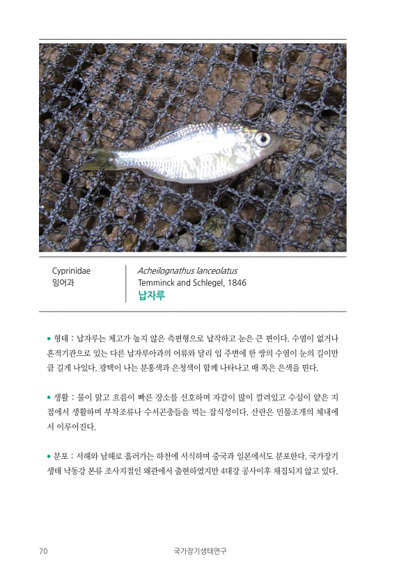 70 국가장기생태연구 ? 형태 납자루는 체고가 높지 않은 측편형으로 납작하고 눈은 큰 편이다. 수염이 없거나 흔적기관으로 있는 다른 납자루아과의 어류와 달리 입 주변에 한 쌍의 수염이 눈의 길이만 큼 길게 나있다. 광택이 나는 분홍색과 은청색이 함께 나타나고 배 쪽은 은색을 띤다. ? 생활 물이 맑고 흐름이 빠른 장소를 선호하며 자갈이 많이 깔려있고 수심이 얕은 지 점에서 생활하며 부착조류나 수서곤충들을 먹는 잡식성이다. 산란은 민물조개의 체내에 서 이루어진다. ? 분포 서해와 남해로 흘러가는 하천에 서식하며 중국과 일본에서도 분포한다. 국가장기 생태 낙동강 본류 조사지점인 왜관에서 출현하였지만 4대강 공사이후 채집되지 않고 있다. Cyprinidae 잉어과 Acheilognathus lanceolatus ...
