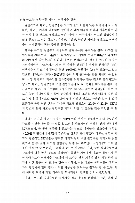 57 나 아고산 침엽수림 지역의 식생지수 변화 일반적으로 아고산 침엽수종은 고도가 높고 기온이 낮은 지역에 주로 서식 하며 아고산 기후에 적응하며 살아가고 있기 때문에 미래의 기후변화로 인 한 영향이 클 것으로 예상되고 있다 이에 본 연구에서는 아고산 침엽수림이 넓게 분포하고 있는 향로봉 방태산 지리산 한라산 지역을 대상으로 식생지 수의 시계열적인 변화 추세를 분석하였다 향로봉 아고산 침엽수의 식생지수 변화 추세를 분석해본 결과 아고산 침 엽수림의 전체 면적 에서 식생지수 감소지역의 면적은 로 약 의 지역에서 감소추세가 나타난 것으로 분석되었다 향로봉 아고산 침엽수 서식지역에서 감소추세가 가장 큰 지역을 선정하여 추세를 분석해본 결과 식생지수의 감소추세 경향은 연간 로 평균대비 씩 감소하고 있는 것으로 나타...