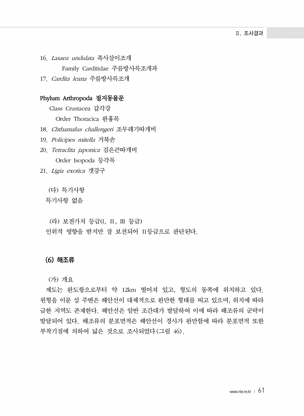 Ⅱ. 조사결과 www.nie.re.kr ? 61 16. Lasaea undulata 족사살이조개 Family Carditidae 주름방사륵조개과 17. Cardita leana 주름방사륵조개 Phylum Arthropoda 절지동물문 Class Crustacea 갑각강 Order Thoracica 완흉목 18. Chthamalus challengeri 조무래기따개비 19. Policipes mitella 거북손 20. Tetraclita japonica 검은큰따개비 Order Isopoda 등각목 21. Ligia exotica 갯강구 다 특기사항 특기사항 없음 라 보전가치 등급 I, Ⅱ, Ⅲ 등급 인위적 영향을 받지만 잘 보전되어 Ⅱ등급으로 판단된다. 6 해조류 가 개요 제도는 완도항으로부터 약 12km ...