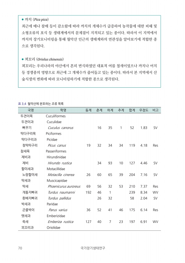 70 국가장기생태연구 ● 까치 Pica pica 최근에 매나 참매 등이 감소함에 따라 까치의 개체수가 급증하여 농작물에 대한 피해 및 소형조류의 포식 등 생태계에서의 문제점이 지적되고 있는 종이다. 따라서 이 지역에서 까치의 장기모니터링을 통해 월악산 인근의 생태계와의 연관성을 알아보기에 적합한 종 으로 생각된다. ● 꾀꼬리 Oriolus chinensis 꾀꼬리는 우리나라의 야산에서 흔히 번식하였던 대표적 여름 철새이었으나 까치나 어치 등 경쟁종의 영향으로 최근에 그 개체수가 줄어들고 있는 종이다. 따라서 본 지역에서 산 숲식생의 변화에 따라 모니터링하기에 적합한 종으로 생각된다. 국명 학명 동계 춘계 하계 추계 합계 우점도 비고 두견이목 Cuculiformes 두견이과 Cuculidae 뻐꾸기 Cucul...