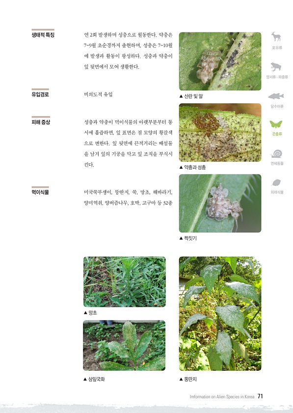 포유류 양서류 · 파충류 담수어류 곤충류 연체동물 외래식물 Imformation on Alien Species in Korea 71 생태적 특징 연 2회 발생하며 성충으로 월동한다. 약충은 79월 초순경까지 출현하며, 성충은 710월 에 발생과 활동이 왕성하다. 성충과 약충이 잎 뒷면에서 모여 생활한다. 유입경로 비의도적 유입 피해 증상 성충과 약충이 먹이식물의 아랫부분부터 동 시에 흡즙하면, 잎 표면은 점 모양의 황갈색 으로 변한다. 잎 뒷면에 끈적거리는 배설물 을 남겨 잎의 기공을 막고 잎 조직을 부식시 킨다. 먹이식물 미국쑥부쟁이, 뚱딴지, 쑥, 망초, 해바라기, 양미역취, 양버즘나무, 호박, 고구마 등 32종 ▲ 산란 및 알 ▲ 약충과 성충 ▲ 짝짓기 ▲ 삼잎국화 ▲ 망초 ▲뚱딴지