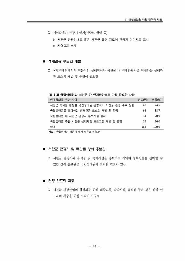 Ⅴ. 상생발전을 위한 정책적 제언 61 ¡ 지역축제나 관광지 연계 관람료 할인 등 ▷ 서천군 관광안내도 혹은 서천군 읍면 지도에 관광지 이미지로 표시 ▷ 지역축제 소개 n 생태관광 루트의 개발 ¡ 국립생태원에서의 전문적인 생태전시와 서천군 내 생태관광지를 연계하는 생태관 광 코스의 개발 및 운영이 필요함 [표 5-3] 국립생태원과 서천군 간 연계방안으로 가장 중요한 사항 연계강화를 위한 사항 빈도 명 비중 % 서천군 축제를 활용한 국립생태원 관람객의 서천군 관광 수요 창출 40 24.5 국립생태원을 포함하는 생태관광 코스의 개발 및 운영 63 38.7 국립생태원 내 서천군 관광지 홍보시설 설치 34 20.9 국립생태원 주관 서천군 생태체험 프로그램 개발 및 운영 26 16.0 합계 163 100.0 자료 국...