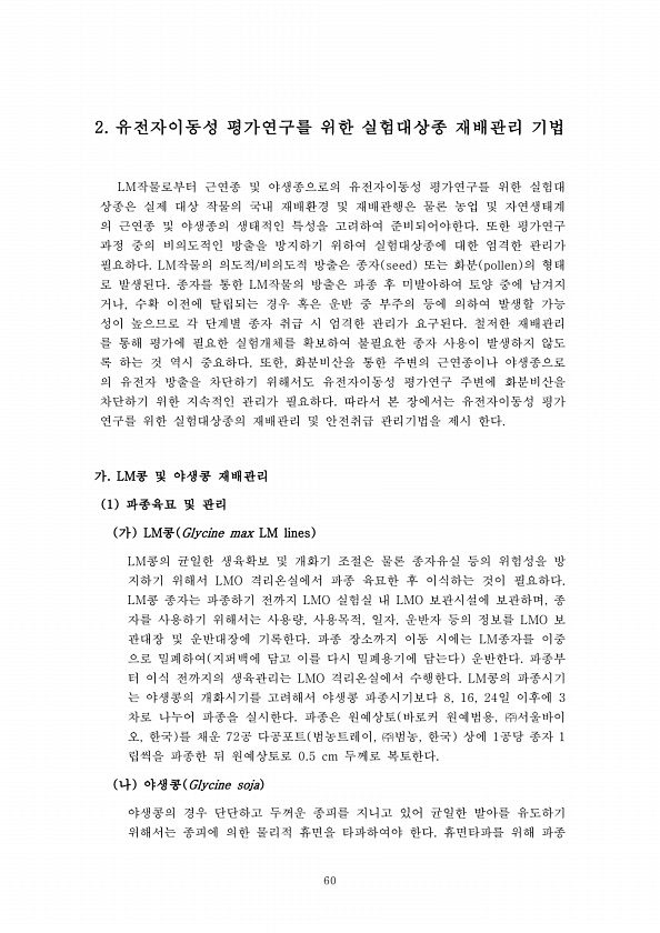 60 2. 유전자이동성 평가연구를 위한 실험대상종 재배관리 기법 LM작물로부터 근연종 및 야생종으로의 유전자이동성 평가연구를 위한 실험대 상종은 실제 대상 작물의 국내 재배환경 및 재배관행은 물론 농업 및 자연생태계 의 근연종 및 야생종의 생태적인 특성을 고려하여 준비되어야한다. 또한 평가연구 과정 중의 비의도적인 방출을 방지하기 위하여 실험대상종에 대한 엄격한 관리가 필요하다. LM작물의 의도적/비의도적 방출은 종자 seed 또는 화분 pollen 의 형태 로 발생된다. 종자를 통한 LM작물의 방출은 파종 후 미발아하여 토양 중에 남겨지 거나, 수확 이전에 탈립되는 경우 혹은 운반 중 부주의 등에 의하여 발생할 가능 성이 높으므로 각 단계별 종자 취급 시 엄격한 관리가 요구된다. 철저한 재배관리 를 통해 ...