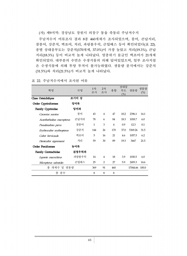 46 자 제9지역경상남도 창원시 의창구 동읍 죽동리 주남저수지 주남저수지 어류조사 결과 8종 460개체가 조사되었으며, 붕어, 큰납지리, 참붕어, 강준치, 백조어, 치리, 파랑볼우럭, 큰입배스 등이 확인되었다 표 22 종별 상대풍부도는 강준치 170개체, 37.0% 이 가장 높았고 치리 19.3% , 큰납 지리 18.3% 등이 비교적 높게 나타났다. 멸종위기 Ⅱ급인 백조어가 21개체 확인되었다. 대부분의 수면은 수생식물의 의해 덮여있었으며, 일부 조사지점 은 수생식물에 의해 투망 투척이 불가능하였다. 생물량 분석에서는 강준치 31.5% 와 치리 21.5% 가 비교적 높게 나타났다. 학명 국명 1차 조사 2차 조사 총합 상대풍 부도 % 생물량 생물량 % Class Osteichthyes 조기어 강 Order ...