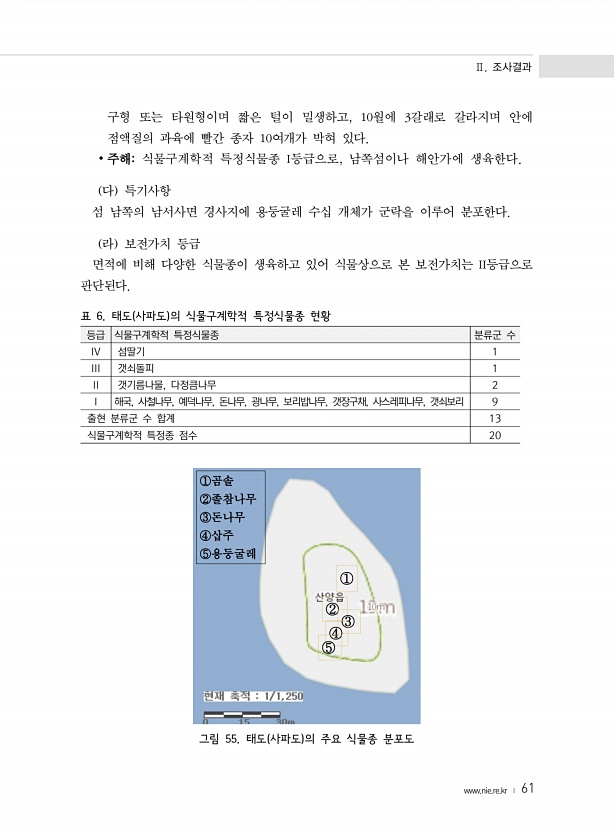 Ⅱ. 조사결과 www.nie.re.kr ? 61 구형 또는 타원형이며 짧은 털이 밀생하고, 10월에 3갈래로 갈라지며 안에 점액질의 과육에 빨간 종자 10여개가 박혀 있다. ? 주해식물구계학적 특정식물종 I등급으로, 남쪽섬이나 해안가에 생육한다. 다 특기사항 섬 남쪽의 남서사면 경사지에 용둥굴레 수십 개체가 군락을 이루어 분포한다. 라 보전가치 등급 면적에 비해 다양한 식물종이 생육하고 있어 식물상으로 본 보전가치는 II등급으로 판단된다. 표 6. 태도 사파도 의 식물구계학적 특정식물종 현황 등급 식물구계학적 특정식물종 분류군 수 IV 섬딸기 1 III 갯쇠돌피 1 II 갯기름나물, 다정큼나무 2 I 해국, 사철나무, 예덕나무, 돈나무, 광나무, 보리밥나무, 갯장구채, 사스레피나무, 갯쇠보리 9 출현 분류군...