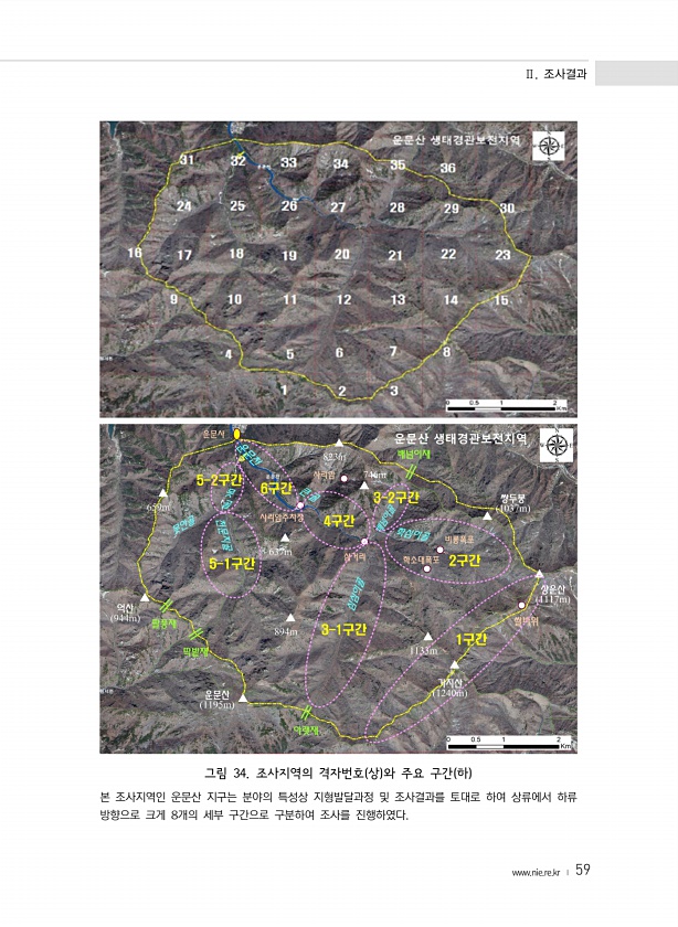 Ⅱ. 조사결과 www.nie.re.kr ? 59 그림 34. 조사지역의 격자번호 상 와 주요 구간 하 본 조사지역인 운문산 지구는 분야의 특성상 지형발달과정 및 조사결과를 토대로 하여 상류에서 하류 방향으로 크게 8개의 세부 구간으로 구분하여 조사를진행하였다.