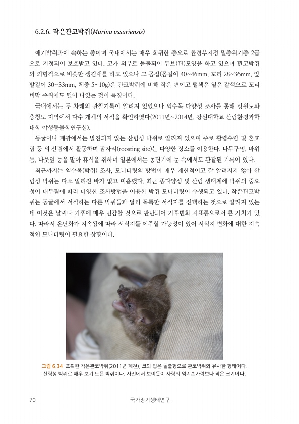 70 국가장기생태연구 6.2.6. 작은관코박쥐 Murina ussuriensis 애기박쥐과에 속하는 종이며 국내에서는 매우 희귀한 종으로 환경부지정 멸종위기종 2급 으로 지정되어 보호받고 있다. 코가 외부로 돌출되어 튜브 관 모양을 하고 있으며 관코박쥐 와 외형적으로 비슷한 생김새를 하고 있으나 그 몸집 몸길이 4046mm, 꼬리 2836mm, 앞 발길이 3033mm, 체중 510g 은 관코박쥐에 비해 작은 편이고 털색은 옅은 갈색으로 꼬리 비막 주위에도 털이 나있는 것이 특징이다. 국내에서는 두 차례의 관찰기록이 알려져 있었으나 익수목 다양성 조사를 통해 강원도와 충청도 지역에서 다수 개체의 서식을 확인하였다 2011년2014년, 강원대학교 산림환경과학 대학 야생동물학연구실 동굴이나 폐광에서는 발견되지 않...