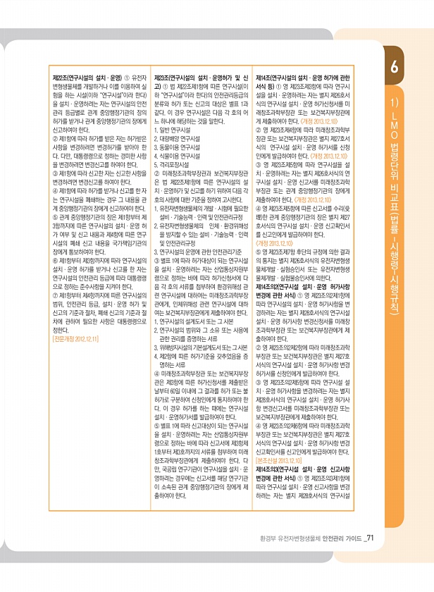 6 환경부 유전자변형생물체 안전관리 가이드 _71 1 L M O 법령단위 비교표 법률- 시행령- 시행규칙 제22조 연구시설의 설치ㆍ운영 ① 유전자 변형생물체를 개발하거나 이를 이용하여 실 험을 하는 시설 이하 “연구시설”이라 한다 을 설치ㆍ운영하려는 자는 연구시설의 안전 관리 등급별로 관계 중앙행정기관의 장의 허가를 받거나 관계 중앙행정기관의 장에게 신고하여야 한다. ② 제1항에 따라 허가를 받은 자는 허가받은 사항을 변경하려면 변경허가를 받아야 한 다. 다만, 대통령령으로 정하는 경미한 사항 을 변경하려면 변경신고를 하여야 한다. ③ 제1항에 따라 신고한 자는 신고한 사항을 변경하려면 변경신고를 하여야 한다. ④ 제1항에 따라 허가를 받거나 신고를 한 자 는 연구시설을 폐쇄하는 경우 그 내용을 관 계 중앙...