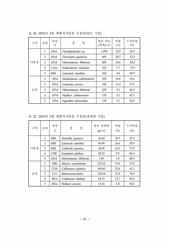 54 구역 순위 분류 군 종 명 평균 개체/밀도 ㎡ 비 % 율 누적비 % 율 낙동강 1 APol Pseudopolydora sp. 1,090 32.9 32.9 2 APol Prionospio japonicus 685 20.7 53.5 3 APol Heteromastus filiformis 485 14.6 68.2 4 CAm Eohaustorius setulosus 255 7.7 75.9 5 MBi Laternula marilina 160 4.8 80.7 금강 1 APol Mediomastus californiensis 505 19.6 19.6 2 APol Leonnates persica 345 13.4 33.1 3 APol Heteromastus filiformis 235 9.1 42.2 4 APol Nep...