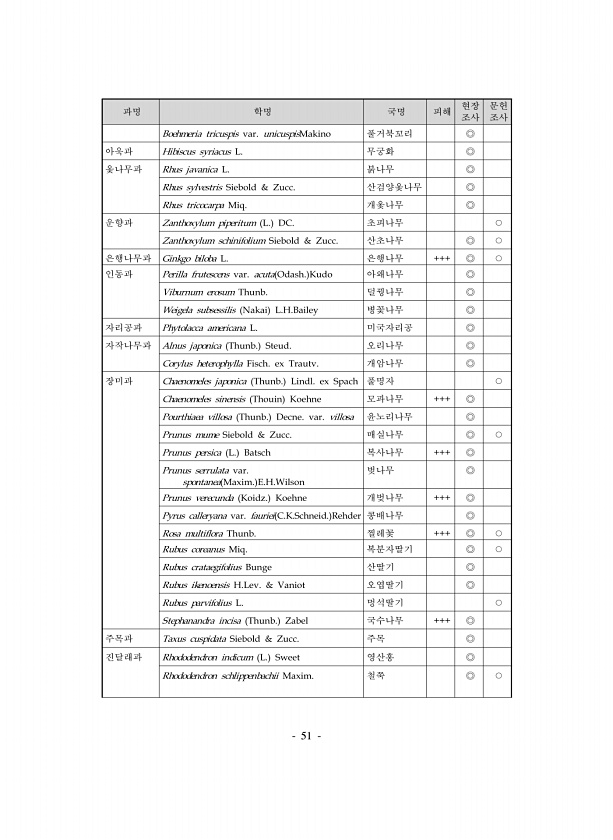 51 과명 학명 국명 피해 현장 조사 문헌 조사 Boehmeria tricuspis var. unicuspisMakino 풀거북꼬리 ◎ 아욱과 Hibiscus syriacus L. 무궁화 ◎ 옻나무과 Rhus javanica L. 붉나무 ◎ Rhus sylvestris Siebold & Zucc. 산검양옻나무 ◎ Rhus tricocarpa Miq. 개옻나무 ◎ 운향과 Zanthoxylum piperitum L. DC. 초피나무 ○ Zanthoxylum schinifolium Siebold & Zucc. 산초나무 ◎ ○ 은행나무과 Ginkgo biloba L. 은행나무 +++ ◎ ○ 인동과 Perilla frutescens var. acuta Odash. Kudo 아왜나무 ◎ Viburnum erosum T...