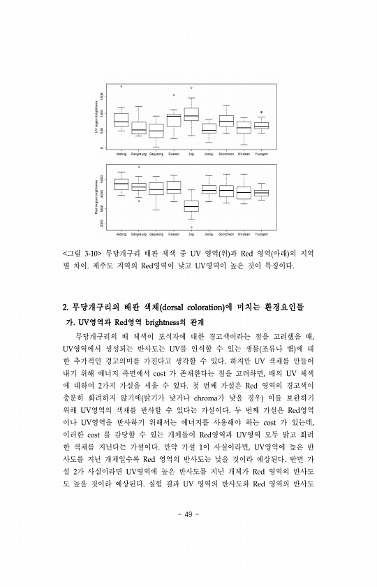 49 그림 3-10 무당개구리 배판 체색 중 UV 영역 위 과 Red 영역 아래 의 지역 별 차이. 제주도 지역의 Red영역이 낮고 UV영역이 높은 것이 특징이다. 2. 무당개구리의 배판 색채 dorsal coloration 에 미치는 환경요인들 가. UV영역과 Red영역 brightness의 관계 무당개구리의 배 체색이 포식자에 대한 경고색이라는 점을 고려했을 때, UV영역에서 생성되는 반사도는 UV를 인식할 수 있는 생물 조류나 뱀 에 대 한 추가적인 경고의미를 가진다고 생각할 수 있다. 하지만 UV 색채를 만들어 내기 위해 에너지 측면에서 cost 가 존재한다는 점을 고려하면, 배의 UV 체색 에 대하여 2가지 가설을 세울 수 있다. 첫 번째 가설은 Red 영역의 경고색이 충분히 화려하지 않기에 밝기가...