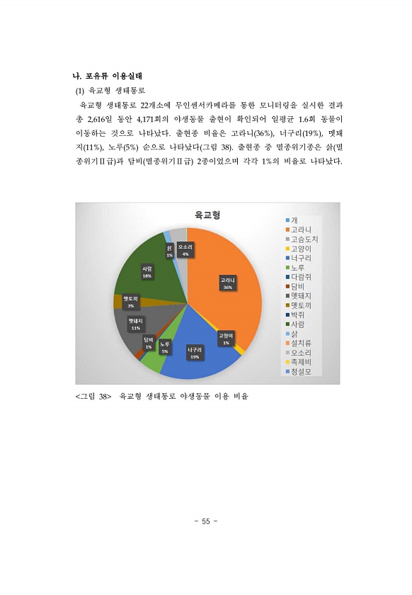 55 나. 포유류 이용실태 1 육교형 생태통로 육교형 생태통로 22개소에 무인센서카메라를 통한 모니터링을 실시한 결과 총 2,616일 동안 4,171회의 야생동물 출현이 확인되어 일평균 1.6회 동물이 이동하는 것으로 나타났다. 출현종 비율은 고라니 36% , 너구리 19% , 멧돼 지 11% , 노루 5% 순으로 나타났다 그림 38 출현종 중 멸종위기종은 삵 멸 종위기Ⅱ급 과 담비 멸종위기Ⅱ급 2종이었으며 각각 1%의 비율로 나타났다. 그림 38 육교형 생태통로 야생동물 이용비율